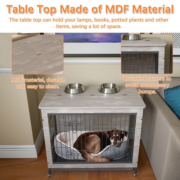 Style meets function with this versatile wooden indoor kennel that serves as a secure space for your pet as well as a practical piece of furniture that easily blends with your interior design. This heavy-duty dog crate is conveniently on rolling casters to be able to move to any room in the house. Dog cage three generously sized entry points including a wide double-door, single side-door, and horizontal lift-top provide easy accessibility. The pet crate two front-facing doors are equipped with premium latches to securely shut closed. Pet cage high-quality iron bars enclose the open-air design to allow for proper ventilation and 360 degree visibility. Give your pet a safe place to rest that doesn't obstruct your room decor thanks to this furniture-style dog pen!