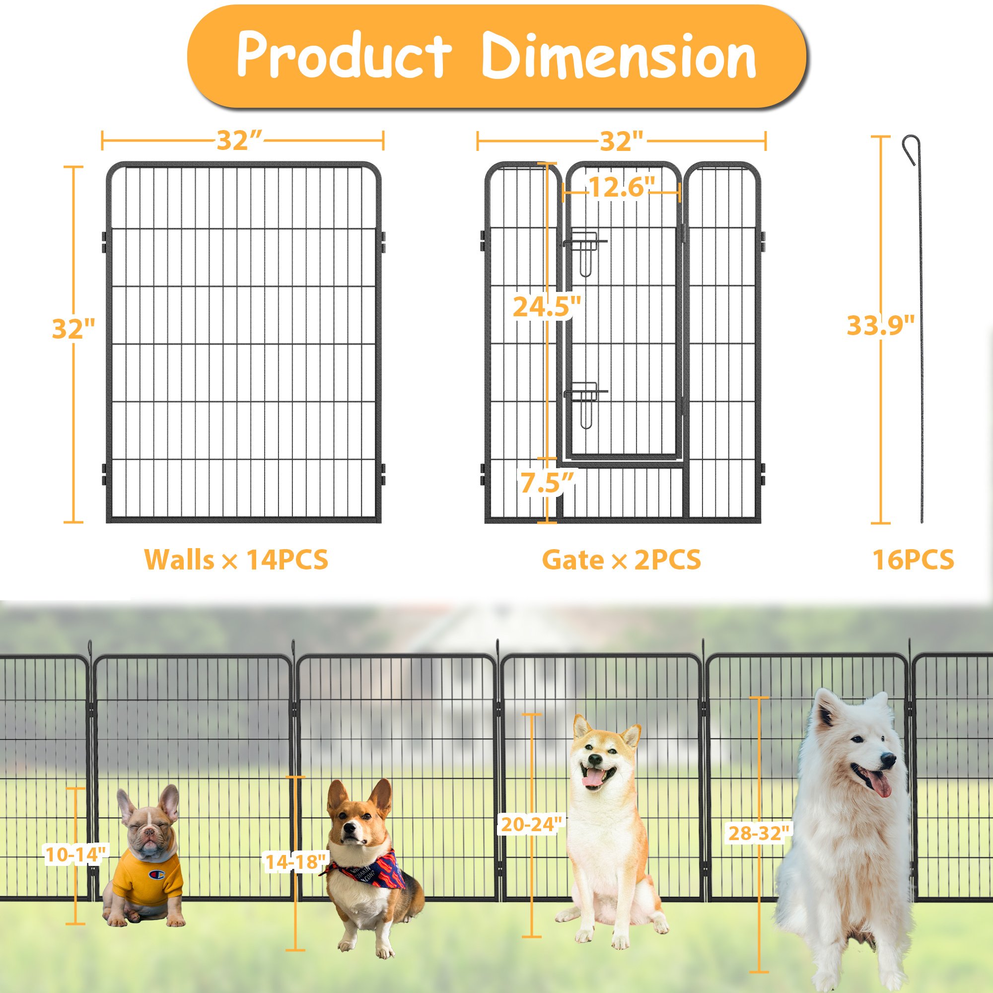 MaterialPowder Coated lronWidth32 inchHeight32 inchPanels14 Panels +2 DoorDoor Size24.5*12.6"(HxW)Mesh Size6.1*1.4"(HxW)Anchor Stake Size33.9Dog SizeSmall/Medium/Large