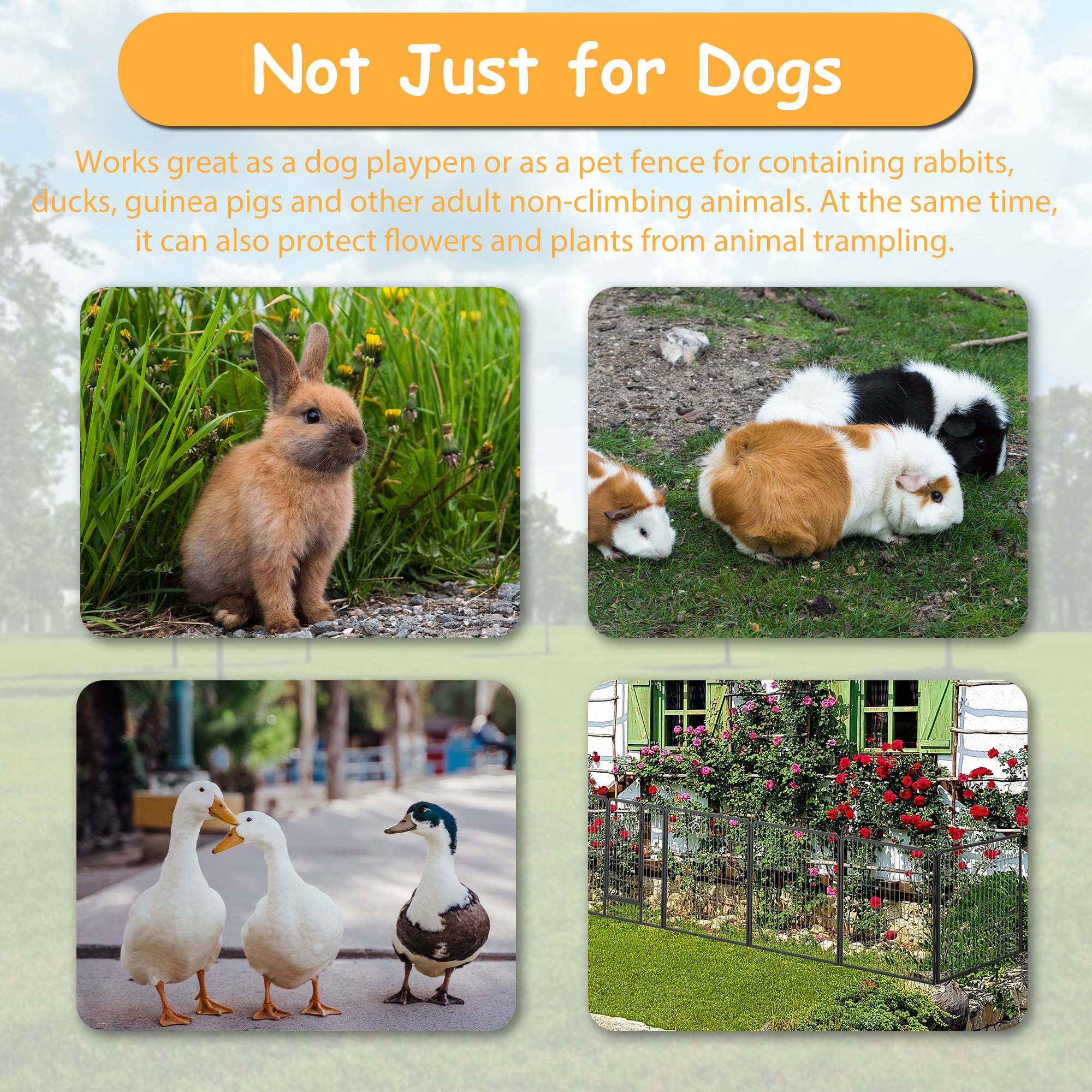 Safe & Secure: Designed with round edges and smooth steel wires, dog run playpen perfectly protect your pets from hurting; The upgraded flat rods can be easily inserted into the ground for greater stability and rigidity.
