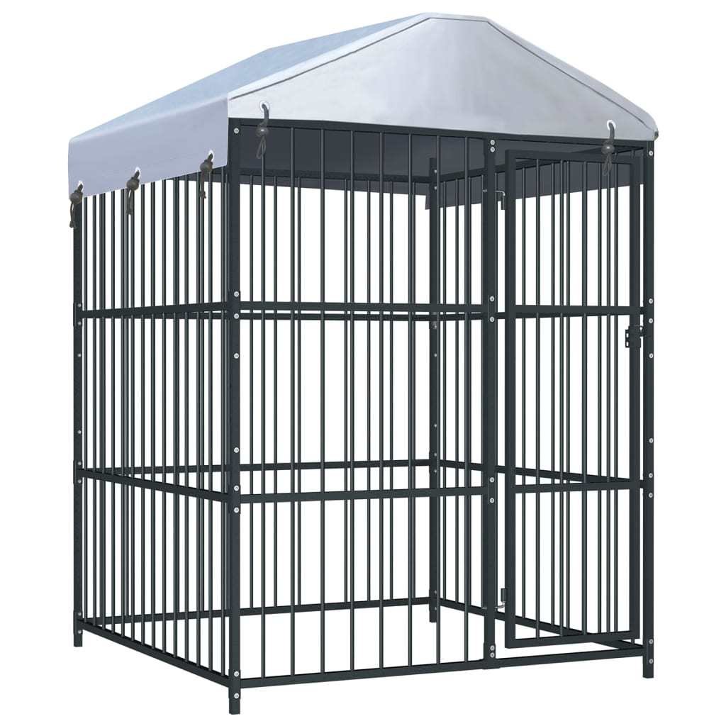 This large dog kennel provides ample exercise space while the steel bar walls help prevent mischief and unexpected accidents while enabling ventilation. Thanks to the sturdy and heavy-duty steel construction, this dog kennel is durable and built to last. The included fire-resistant and UV protected roof is made of 100% polyethylene and protects from the sun, rain, snow, and other harsh weather conditions. The hinged door has a lockable latch system which ensures extra security and safety for your dogs.