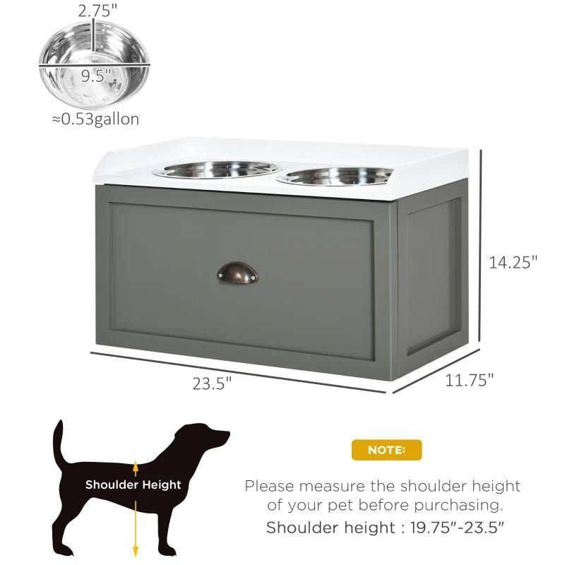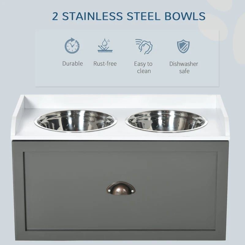 Large drawer for keeping everything under the food and water bowls, saving space.